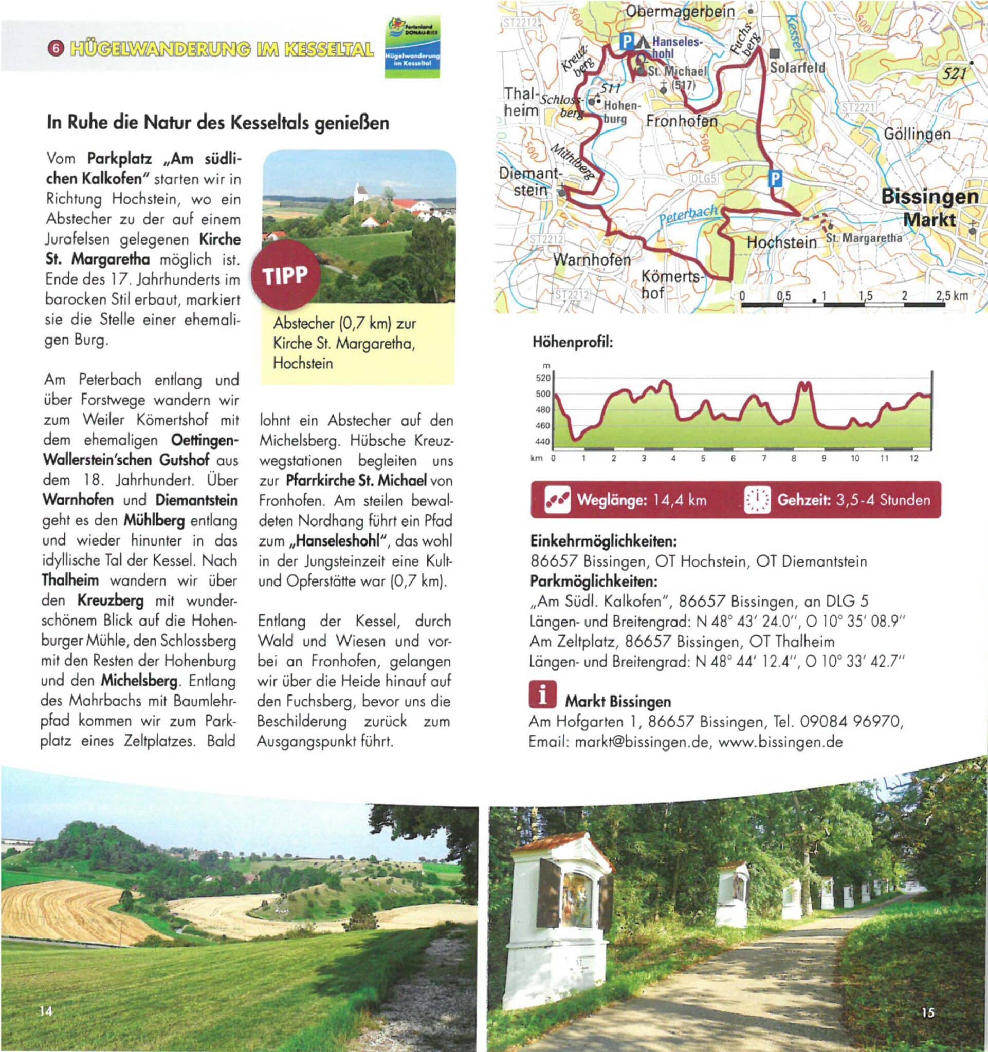 Sie starten am Wanderparkplatz an der Kreisstraße Bissingen-Warnhofen und laufen in Richtung Hochstein. Dort können sie einen Abstecher zur Kirche St. Margaretha machen. Die idyllisch auf einem Jurafelsen gelegene Kirche wurde Ende des 17. Jahrhunderts im barocken Stil erbaut und markiert die Stelle einer ehemaligen Burg. Führungen sind auf Anfrage möglich.