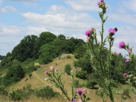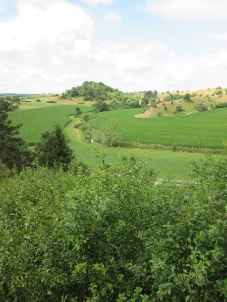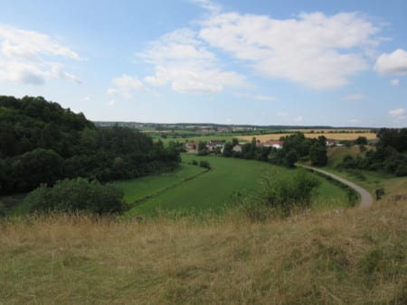 Am Mühlberg wandern Sie vorbei und sehen von hier aus hinüber zum Giebelsberg und zum Steinbruch (Recyclinghof Thalheim). Sie kreuzen die Ortsverbindungsstraße Thalheim-Bissingen und laufen in Richtung Schlossberg durch Thalheim über den Kreuzberg. Dort haben Sie bei einer Ruhebank einen wunderschönen Blick auf die Hohenburger Mühle, den Schlossberg mit den Resten der Hohenburg und den Michelsberg.