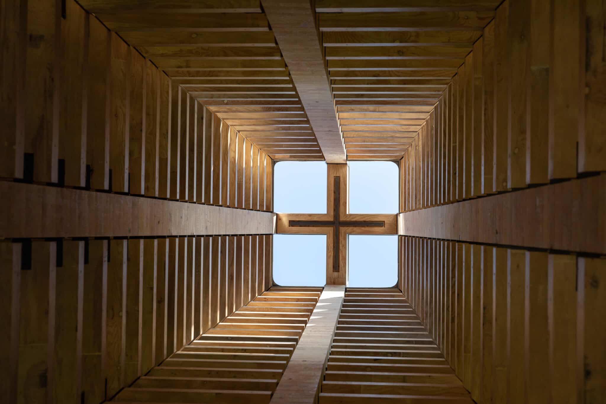 Ein quer zum Hang angelegtes Plateau inszeniert mit einfachen Mitteln den Weg zum Kapellenturm. Der Blick geht in die Landschaft, wenn man den schmalen Steg betritt, den eine lange Sitzbank säumt. Er führt vorbei am Kapellenturm auf eine kleine Fläche mit einer überdachten Bank, die dem Kapelleneingang zugewandt ist. Wer hier rastet, erlangt einen ersten Blick in den Kapellenraum. Betritt man den Turm, wird man von einem meditativen, in gedämpftes Licht getauchten Raum mit einer kleinen Sitzbank empfangen. Durch die höher gelegenen Lamellen fällt Sonnenlicht ein und zeichnet ein flüchtiges Muster auf die Hölzer. Mit zunehmender Höhe verengt sich der Raum und wird schließlich von einem Kreuz begrenzt, das die hölzerne Tragkonstruktion in die Öffnung zeichnet.