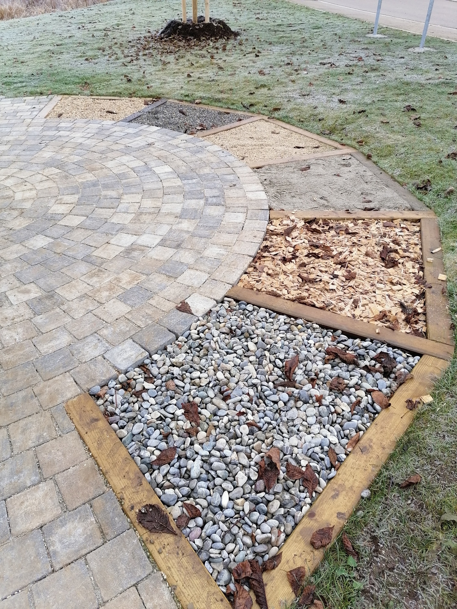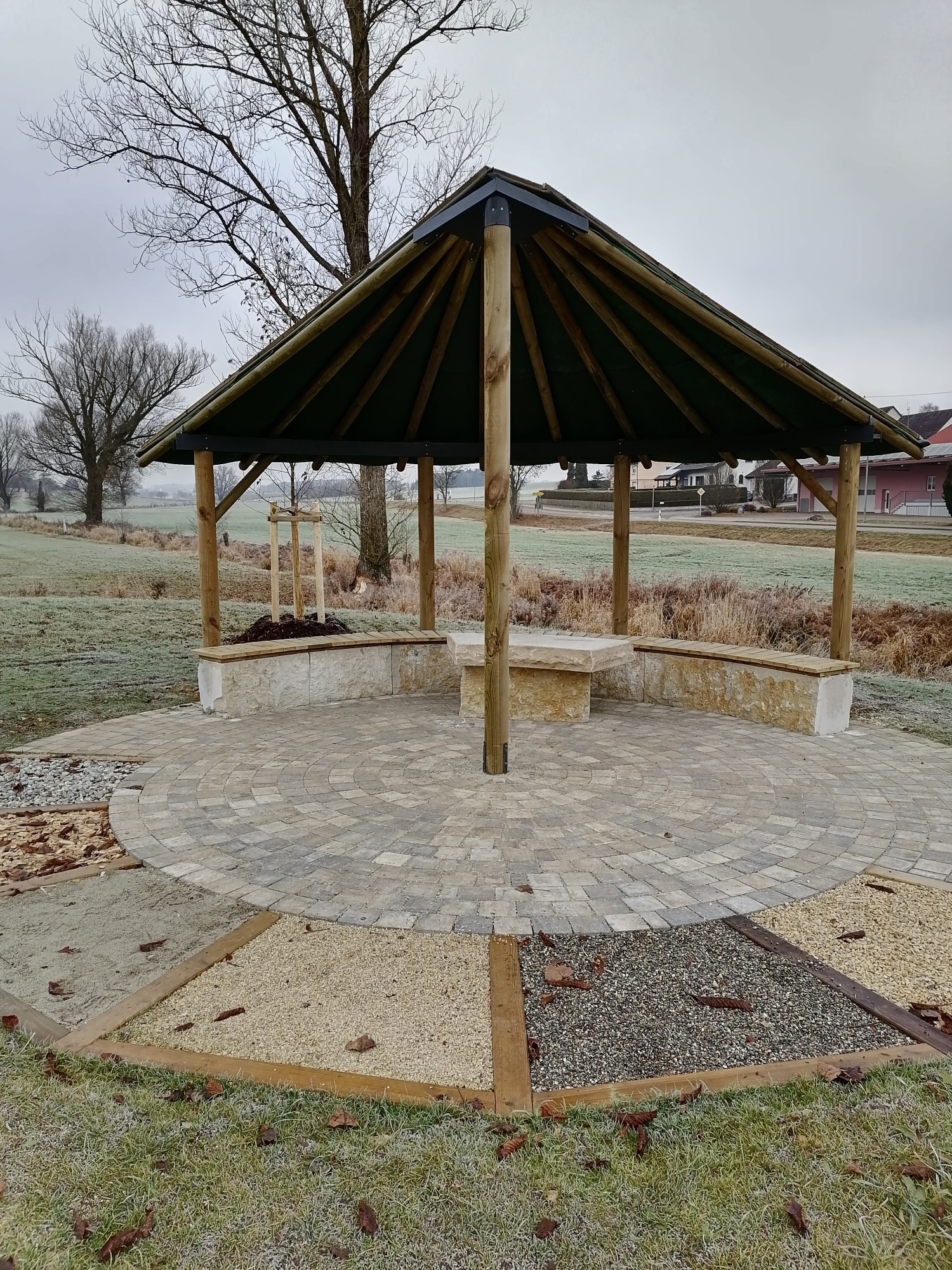 Ein weiterer Bereich der anstehenden Grünfläche ist gepflastert und mit einer halbrunden Steinbank und einem Steintisch ausgestattet, die überdacht ist. Im Halbkreis um die Pflasterfläche ist ein Barfußpfad integriert. Drei Bäume liefern natürlichen Schatten.