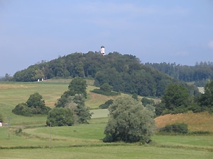 Von hier aus hat man einen schönen Blick auf die Wallfahrtskirche Mariä Himmelfahrt in Buggenhofen.